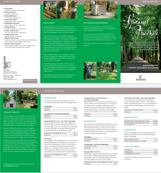 Mit diesem Faltblatt möchten wir Sie über die Angebote der Hanauer Friedhöfe informieren und Ihnen die damit verbundenen Gebühren und Entgelte aufzeigen. Unsere Mitarbeiterinnen und Mitarbeiter stehen Ihnen gerne beratend zur Seite und informieren Sie ausführlich. Wir sind auch Ansprechpartner für alle Ihre Fragen rund um die Bestattung.