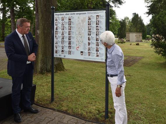 Die drei Anschlagsopfer gehören auch zu den neu hinzugekommenen bekannten Hanauerinnen und Hanauern, die auf einer auf 41 Namen erweiterten Informationstafel mit Lebenslauf verewigt sind. OB Kaminsky enthüllte diesen Grabstätten-Wegweiser zusammen mit Barbara Nagel von der Armin-Nagel-Stiftung, welche die Überarbeitung finanzierte. „Begraben – aber nicht vergessen“ lautet der Titel des Wegweisers, ebenso eines 2008 erschienenen Buchs mit rund 160 bekannten Hanauerinnen und Hanauern, die auf städtischen Friedhöfen beigesetzt wurden.