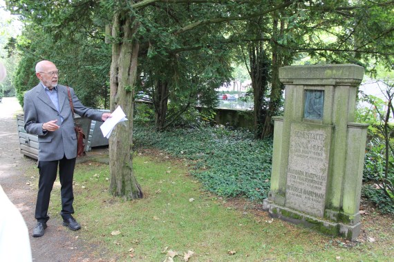Kaminsky bezeichnete das Anlegen des Hauptfriedhofs als „bedeutendes Ereignis der Hanauer Stadtgeschichte“. Historie lasse sich über Personen und Persönlichkeiten besonders gut begreifen. So beispielsweise anhand des ersten Grabsteins von Rebecka Happel, von der direkte Nachfahren leider bis heute nicht hätten ermittelt werden können. Diesem Denkmal gegenüber sei das noch ältere Grabmal der Familie Deines anzutreffen, aber das sei erst 1910 vom Deutschen Friedhof an der Nußallee auf den Hauptfriedhof umgezogen.