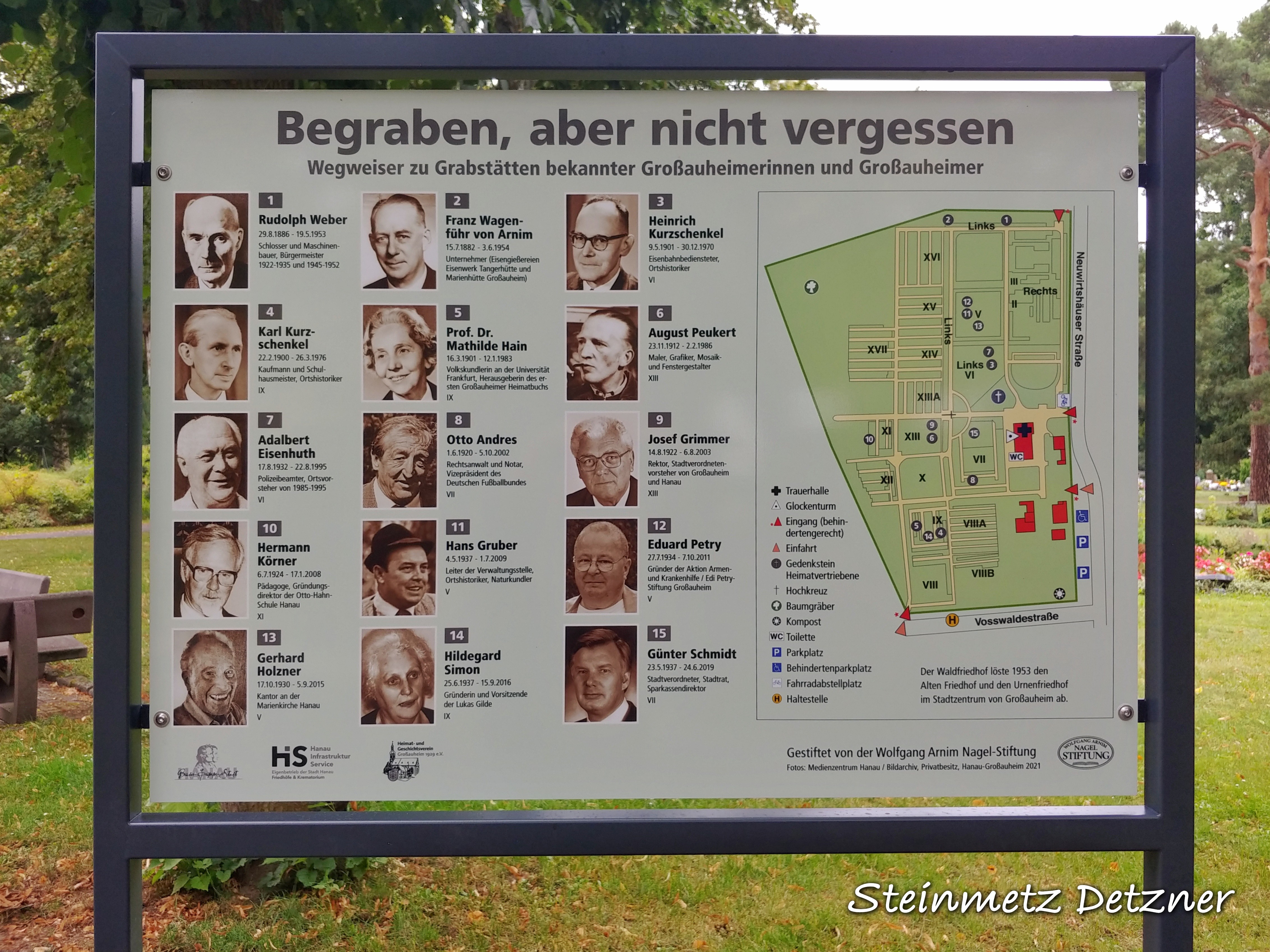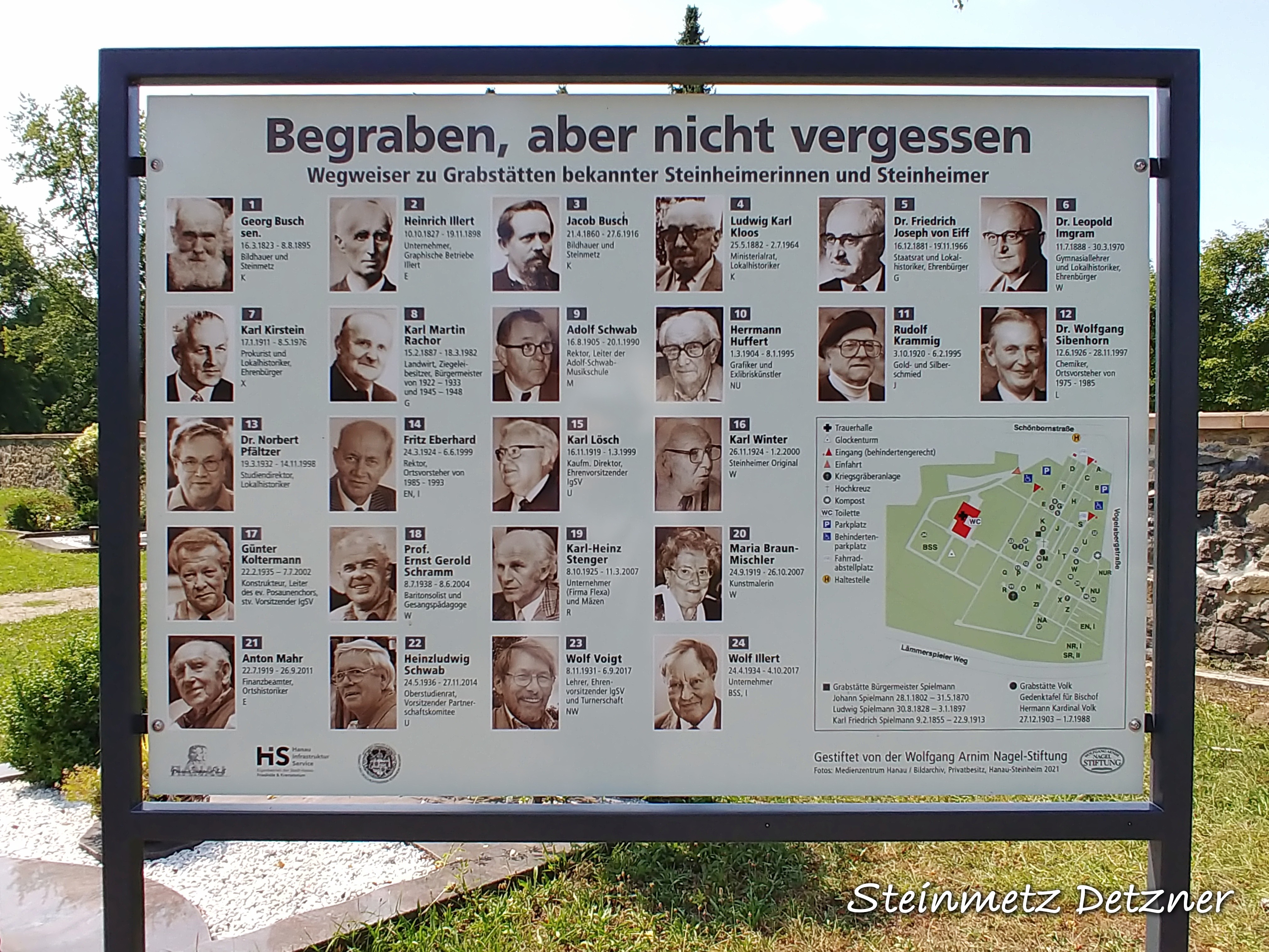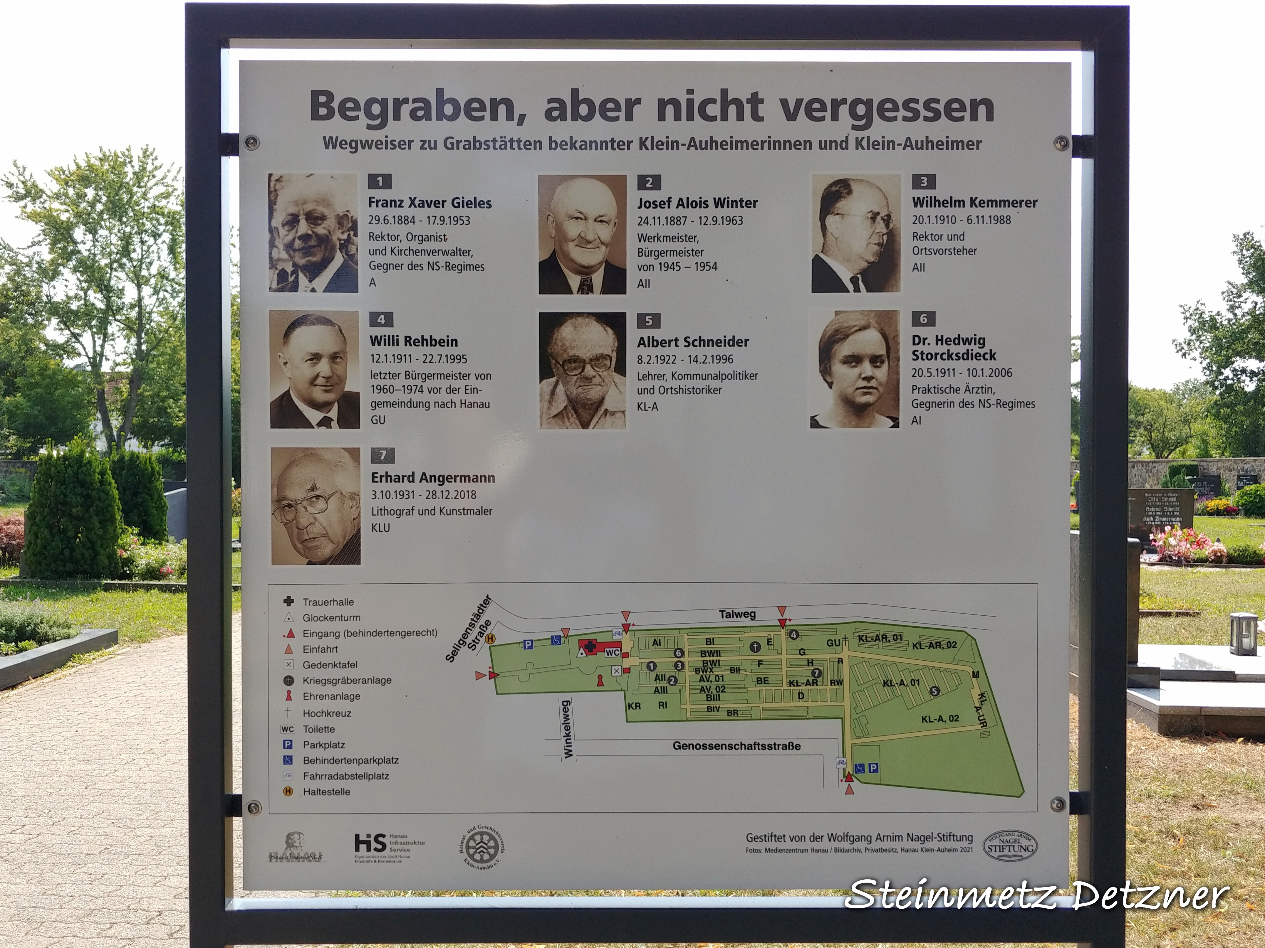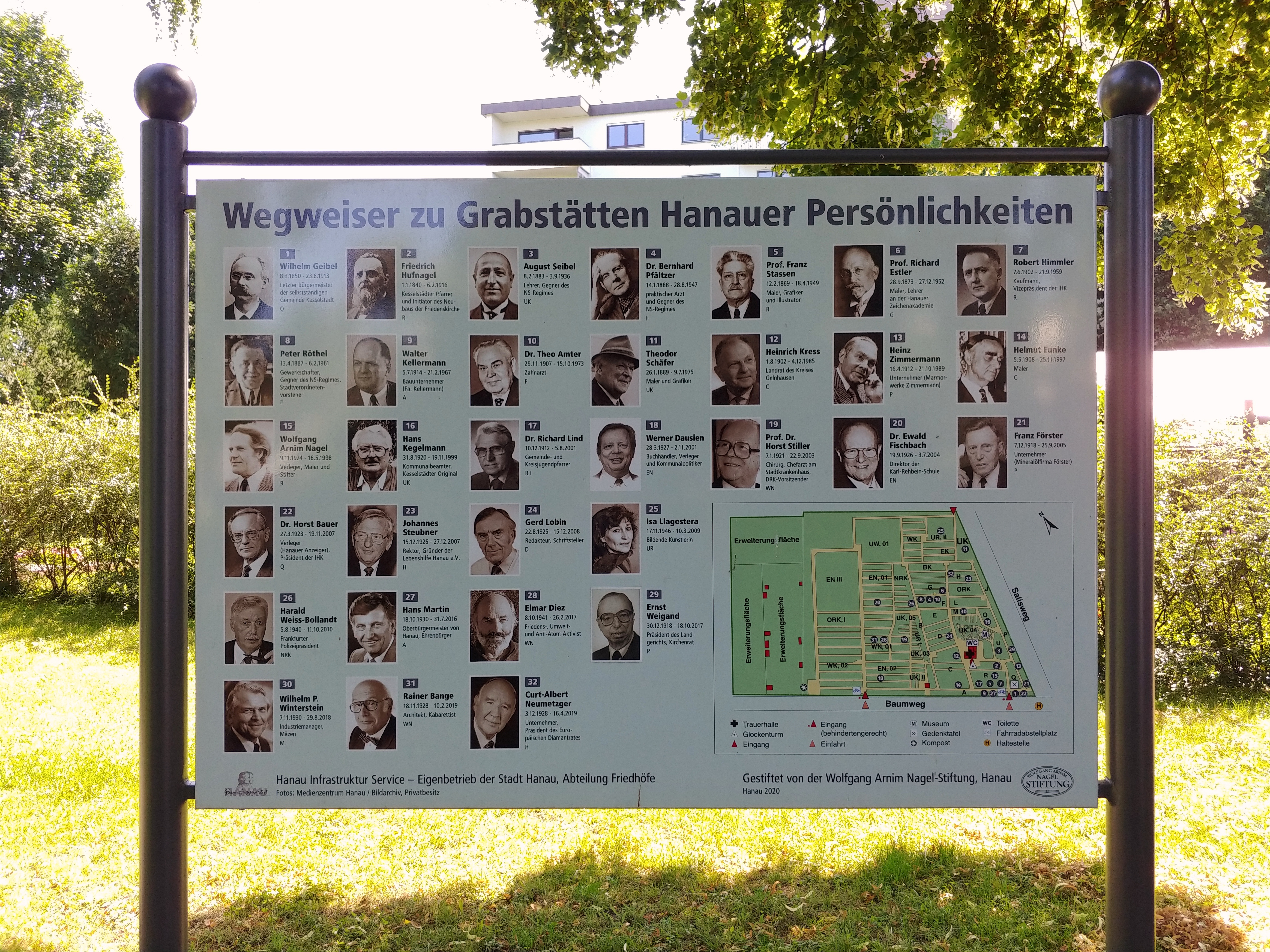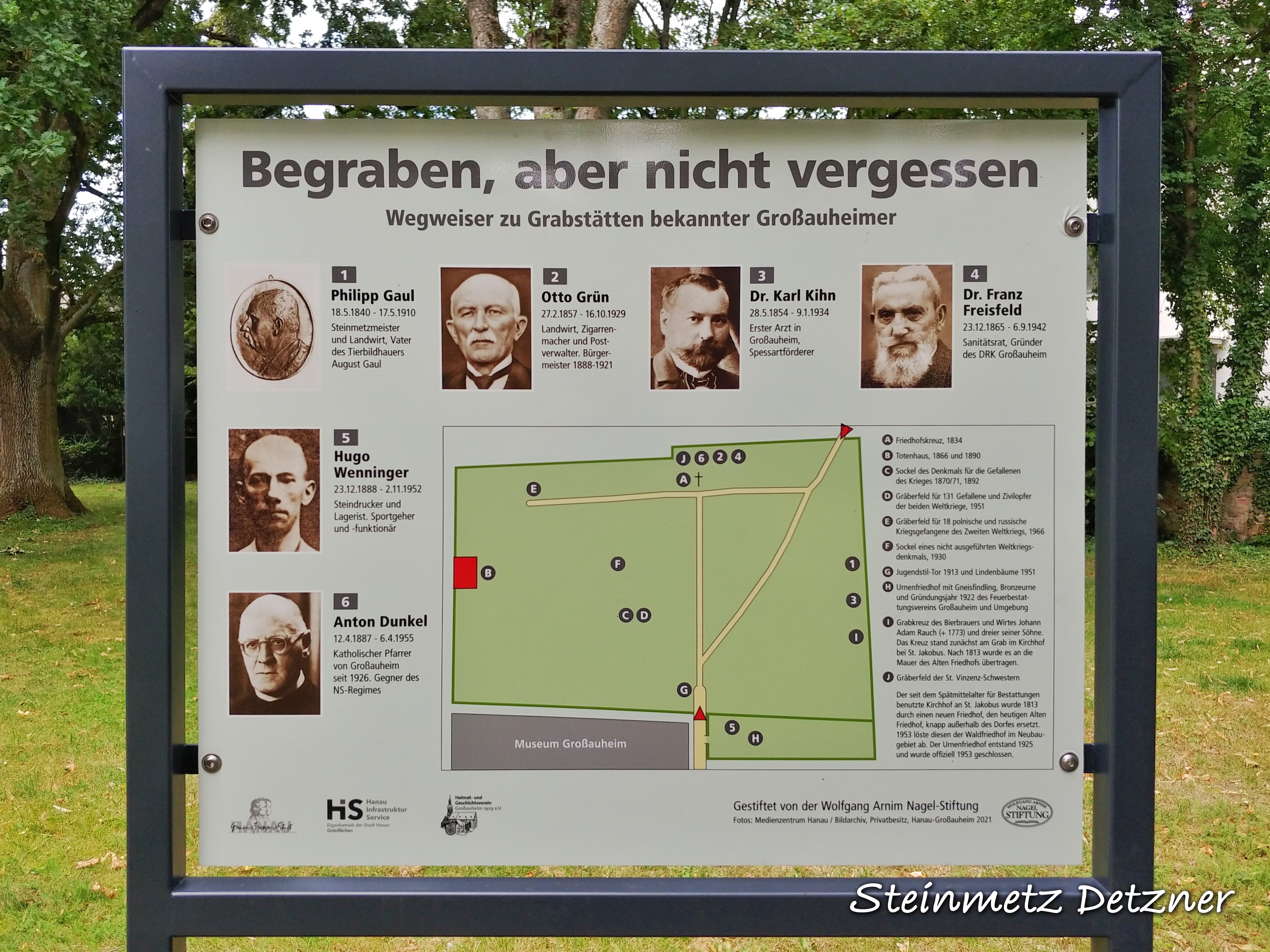 Erneuerte Wegweiser auf Grabstätten bekannter Hanauerinnen und Hanauer. Zu finden auf dem Hanauer Hauptfriedhof, Kesselstädter Friedhof, Waldfriedhof Großheim, Alter Friedhof Großauheim, Friedhof Klein-Auheim, Friedhof Steinheim-Nord, Friedhof Steinheim-Süd, etc.