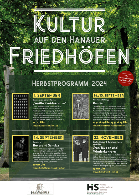 Der Hanauer Illustrator und Comic-Zeichner Rautie stellt am Samstag und Sonntag, 14. und 15. September, ausgewählte Werke auf dem Hanauer Hauptfriedhof aus. Am Abend des 14. Septembers findet auf dem Hauptfriedhof zudem ein Konzert des Singer-Songwriters Reverend Schulzz statt. Die Musik des Hanauers steht in der Tradition amerikanischer Folk-Songs und wird stets unterlegt mit Gitarre und Mundharmonika.