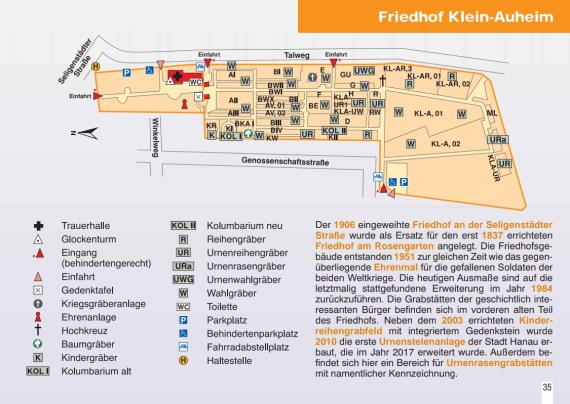 Der Friedhof Klein-Auheim liegt im Süden des Stadtteiles mit dem Haupteingang an der Seligenstädter Straße. In unmittelbarer Nähe befindet sich der Bahnübergang in Richtung Hainstadt.