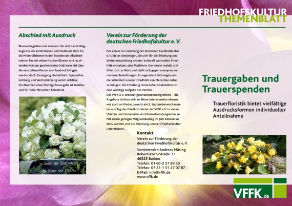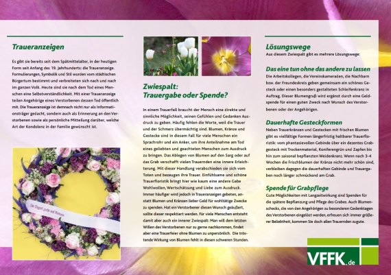 Friedhöfe: Trauergaben und Trauerspenden Trauerfloristik bietet vielfältige Ausdrucksformen individueller Anteilnahme. Faltblatt download (PDF-Dokument | 372 kB)