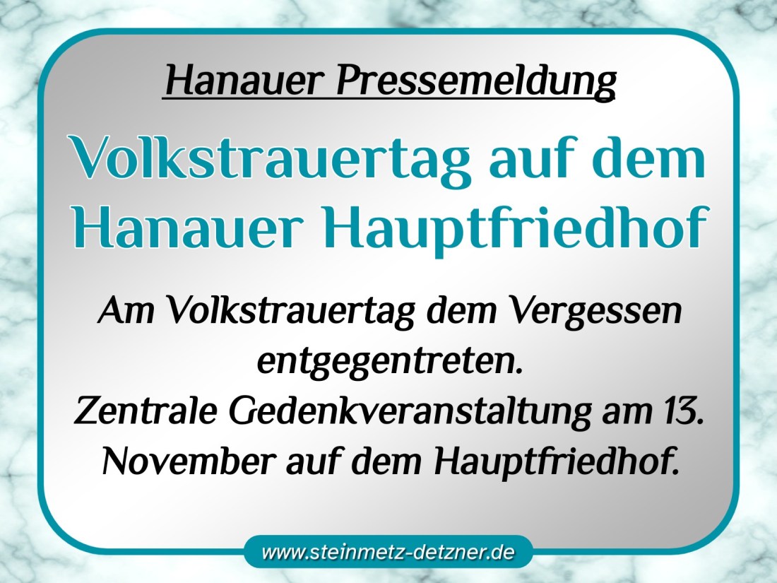 Am Volkstrauertag dem Vergessen entgegentretenZentrale Gedenkveranstaltung um 15 Uhr auf dem Hauptfriedhof. statt. Dort wird Ortsvorsteher Reiner Dunkel zunächst am russischen Gräberfeld einen Kranz niederlegen, bevor er anschließend am deutschen Gräberfeld eine Ansprache hält. Nach der Rede von Monika Rauch-Weigand (VdK OV Großauheim-Wolfgang) wird auch dort gemeinsam ein Kranz niedergelegt. Die Orchestervereinigung Großauheim nimmt die … Weiterlesen Volkstrauertag auf dem Hanauer Hauptfriedhof